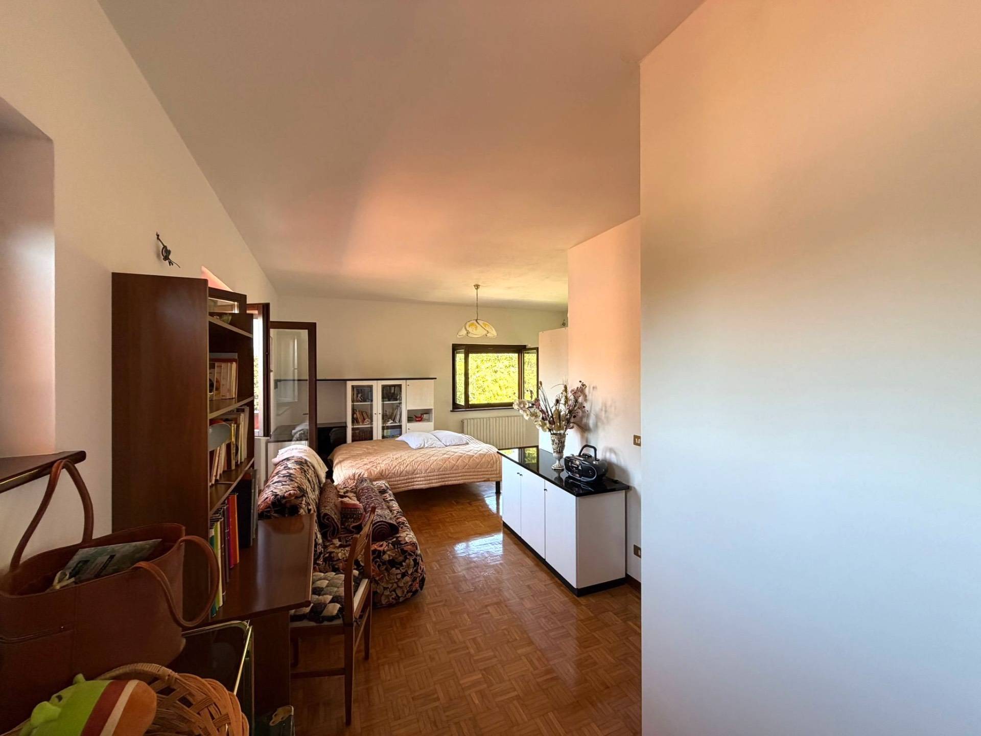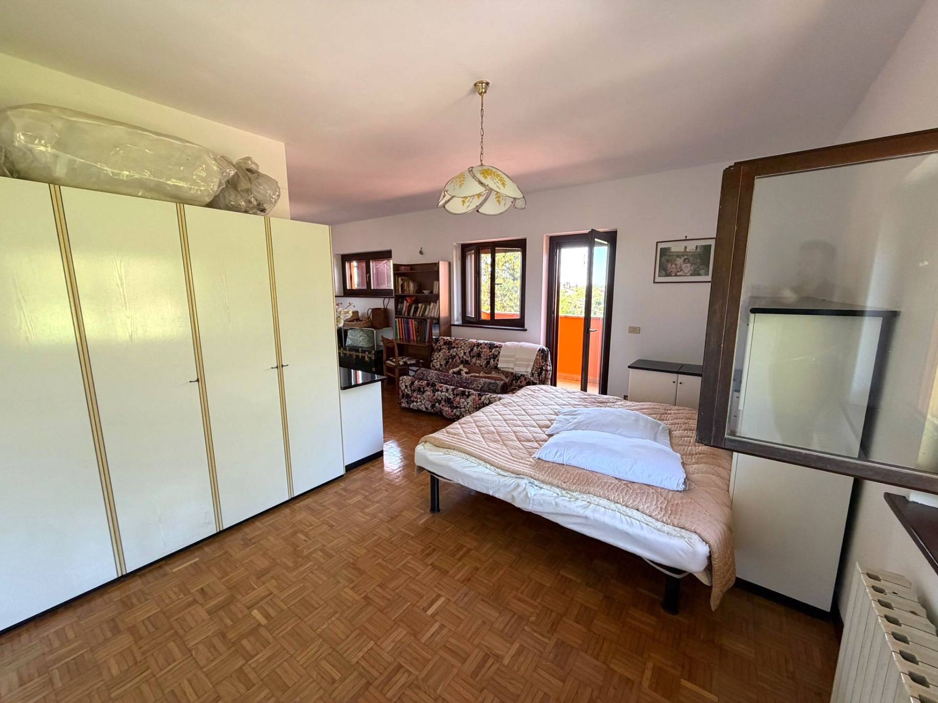 Salendo al piano superiore, troviamo una raffinata camera padronale con balcone e bagno dedicato, un vero rifugio di privacy e relax.